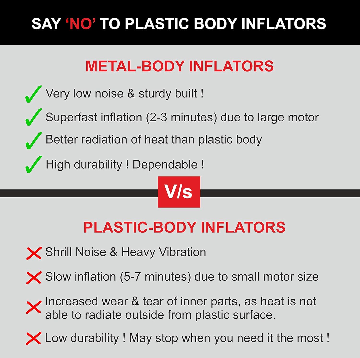 [SOLID METAL BODY INFLATOR] – Unlike other plastic inflators which are delicate and noisy, Bergmann Typhoon is an all-metal. solid-build, heavy-duty, tough and reliable air inflator.;[SAY NO TO PLASTIC INFLATORS] – Most plastic body air compressors are delicate, noisy and not able to radiate out the heat generated during compression. This results in increased wear and tear of the inner parts. Metal air compressors are stronger, sturdier, can radiate heat better and have much lower noise and vibration.