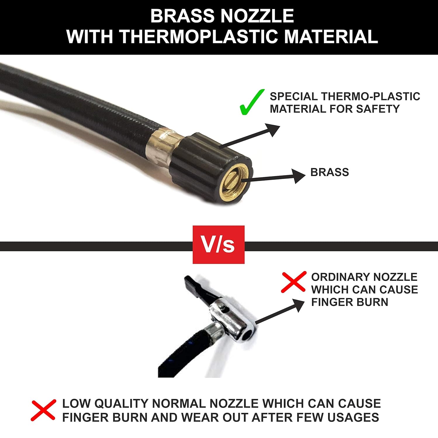 Pure Brass nozzle covered with thermoplastic material to prevent finger burn.