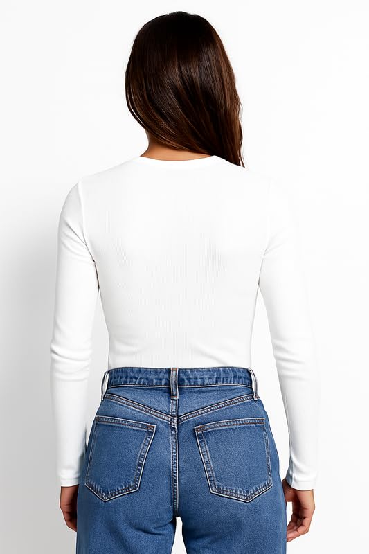 London Hills Women’s Cotton Blend Ribbed Long Sleeve Slim Fit Crew Neck Solid White T-Shirt for Casual & Daily Wear