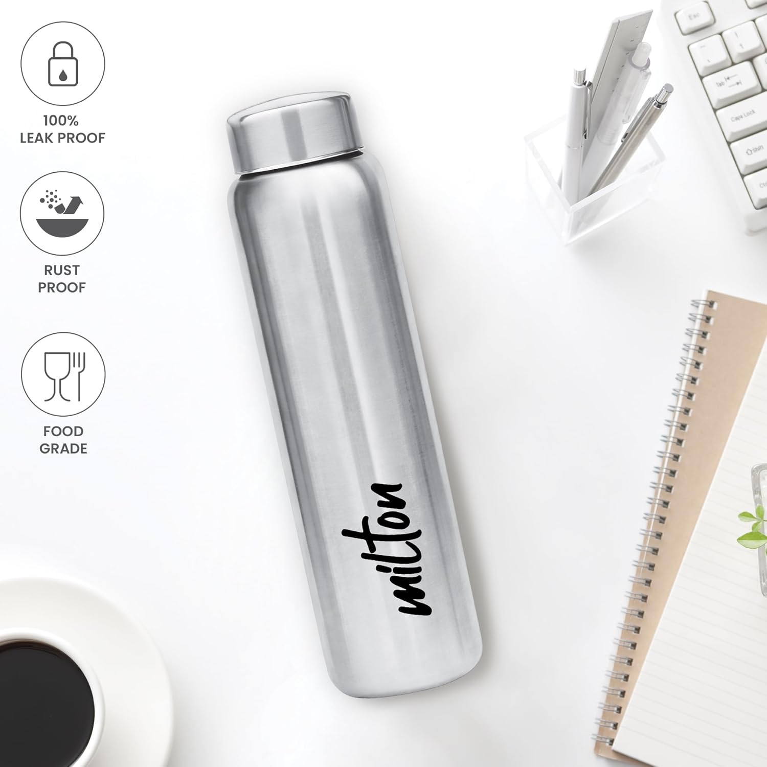 MILTON Aqua 1000 Stainless Steel Water Bottle 920 ml, Set of 3, Single Walled, ISI Certified I Leak Proof Lid, Rust Proof I For School, Office, Gym I Silver